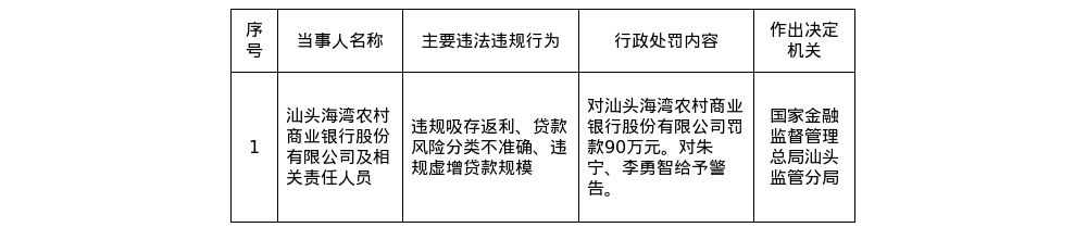 罚单显露,汕头海湾农村买卖银行股份有限公司的主要犯罪违法看成是:违法吸存返利、贷款风险分类不准确、违法虚增贷款鸿沟。
