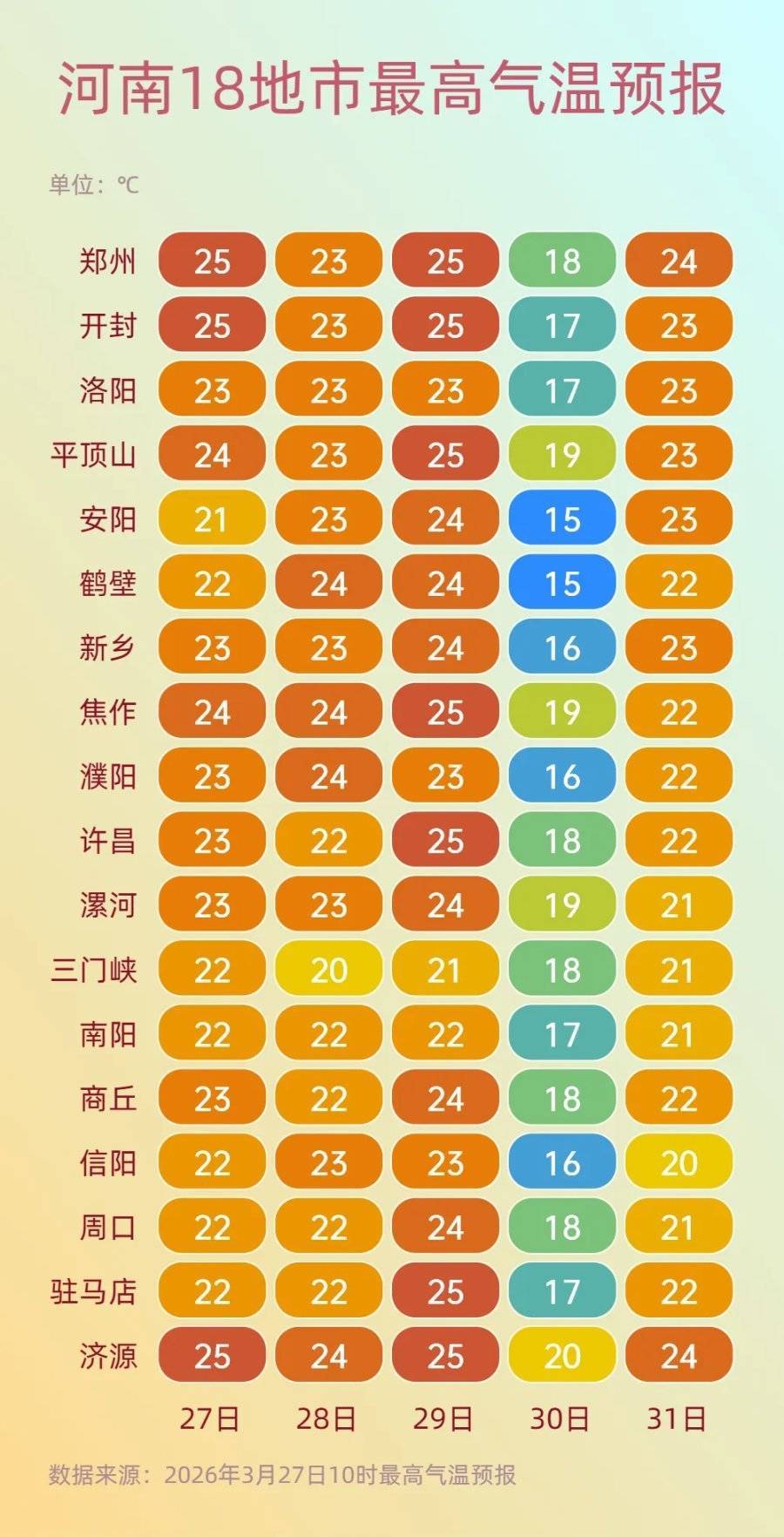 省会郑州今世界午到夜里,好天到多云。偏南风2到3级。最高气温:24到25℃。最低气温:10到11℃