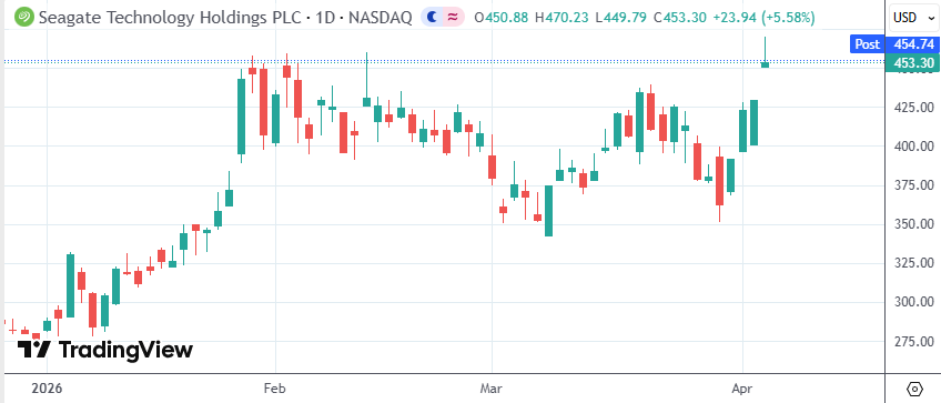 存储想法股无数走高,希捷科技涨5.58%,收于历史新魁伟摩将该股列入其首选股名单。闪迪涨3.28%,好意思光科技涨3.15%,西部数据涨3.11%。